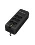Wyposażony w 6 gniazd z bolcem uziemiającym 230V PL, z zabezpieczeniem przeciwprzepięciowym na wszystkich gniazdach, w tym 4 z podtrzymaniem awaryjnym z baterii, UPS ten nadaje się idealnie do wykorzystania w domu czy biurze. Wygląd UPSa zbliżony do wyglądu standardowej listwy zasilającej pozwala na umieszczenie go tam, gdzie standardowy UPS jest nie praktyczny. Specjalna komora na baterie pozwala użytkownikowi na jej łatwą wymianę bez konieczności angażowania zewnętrznego serwisu.